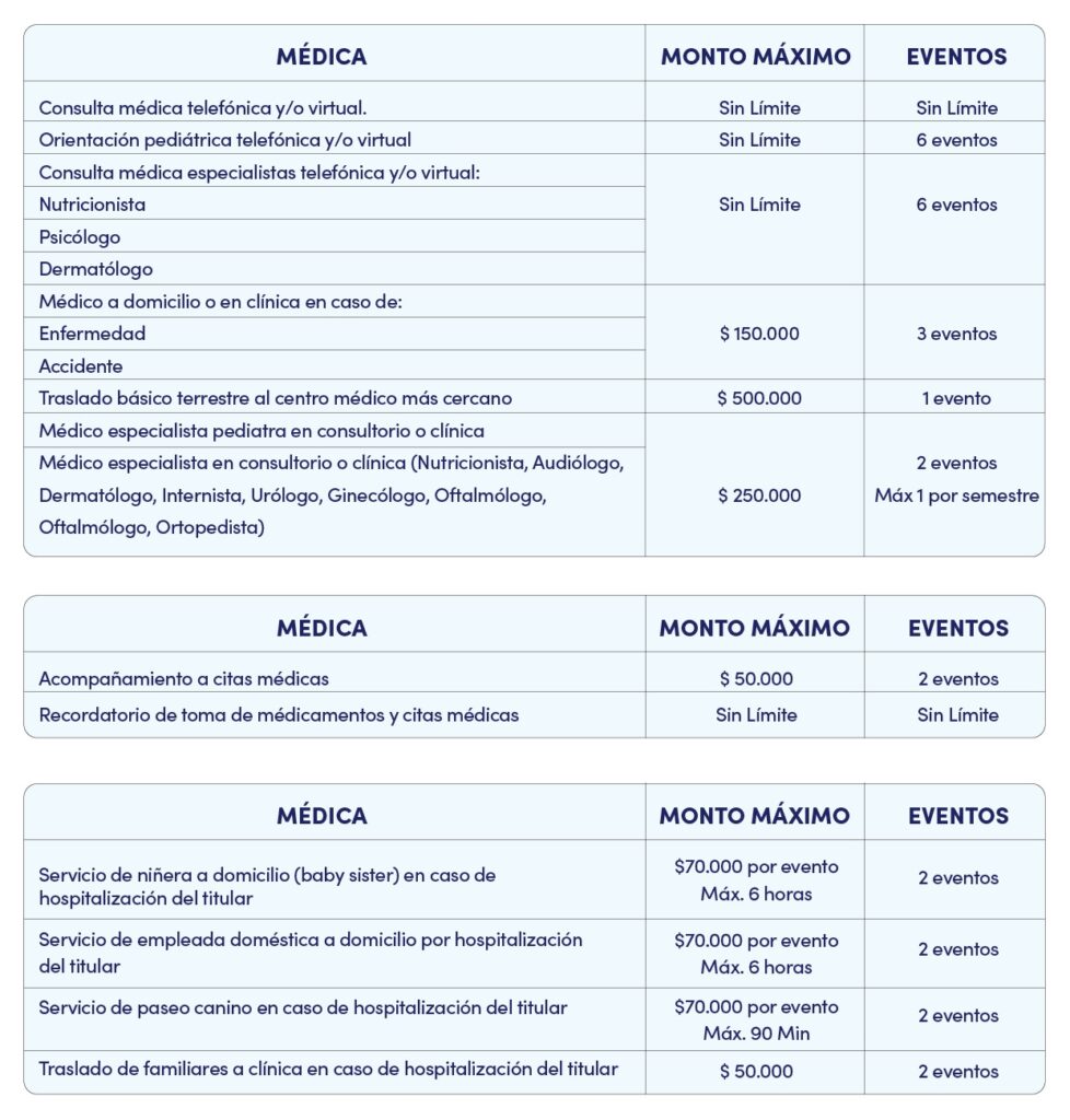 Servicio de asistencia médica que incluye consultas telefónicas y virtuales, atención presencial por enfermedad o accidente, acceso a especialistas y traslados médicos. Incorpora recordatorios de tratamientos, acompañamiento a citas y apoyo logístico en caso de hospitalización del titular.