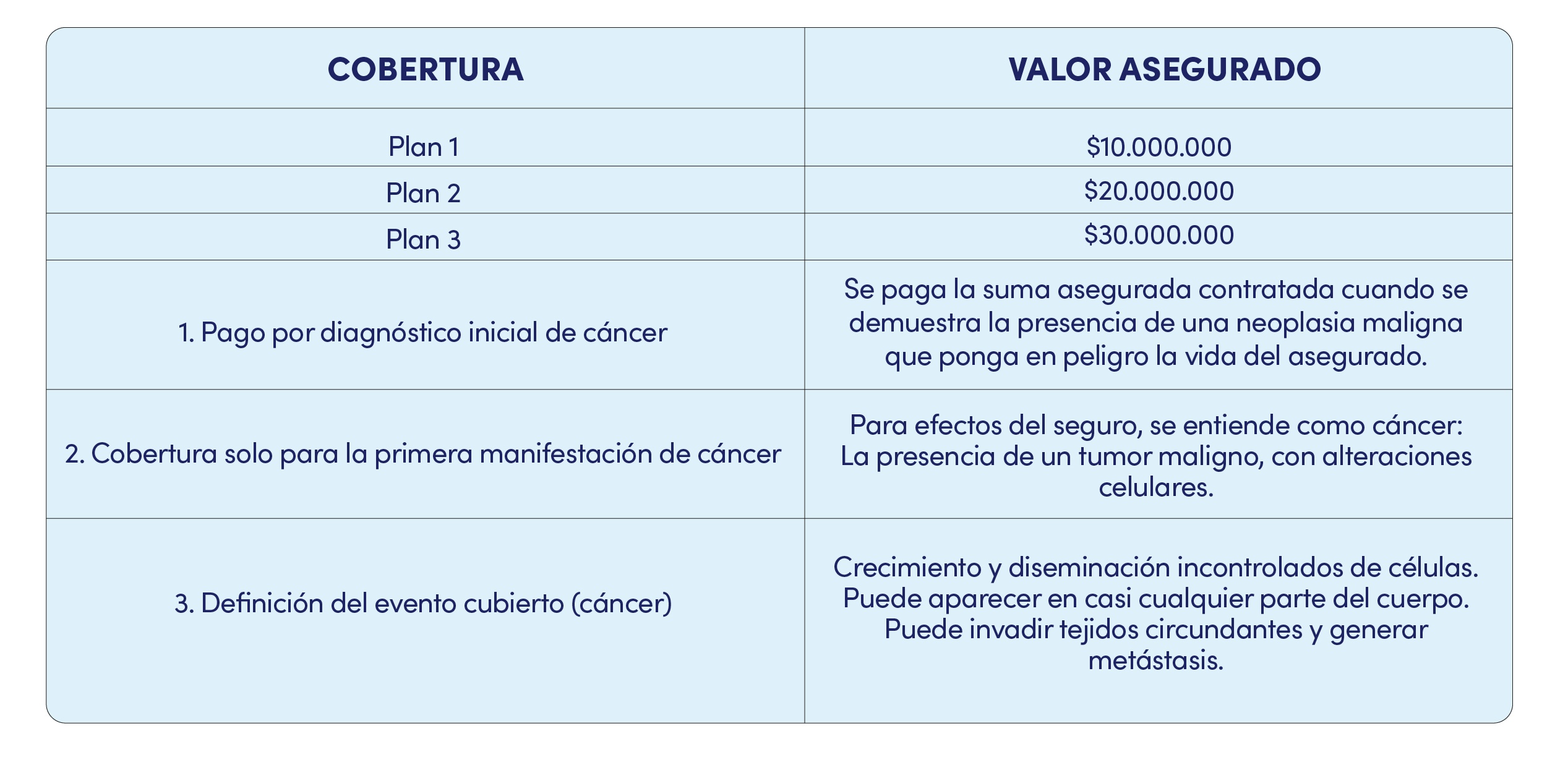- Nota: Si durante el tiempo de espera o carencia se diagnostica el cáncer, no será objeto de esta cobertura.
